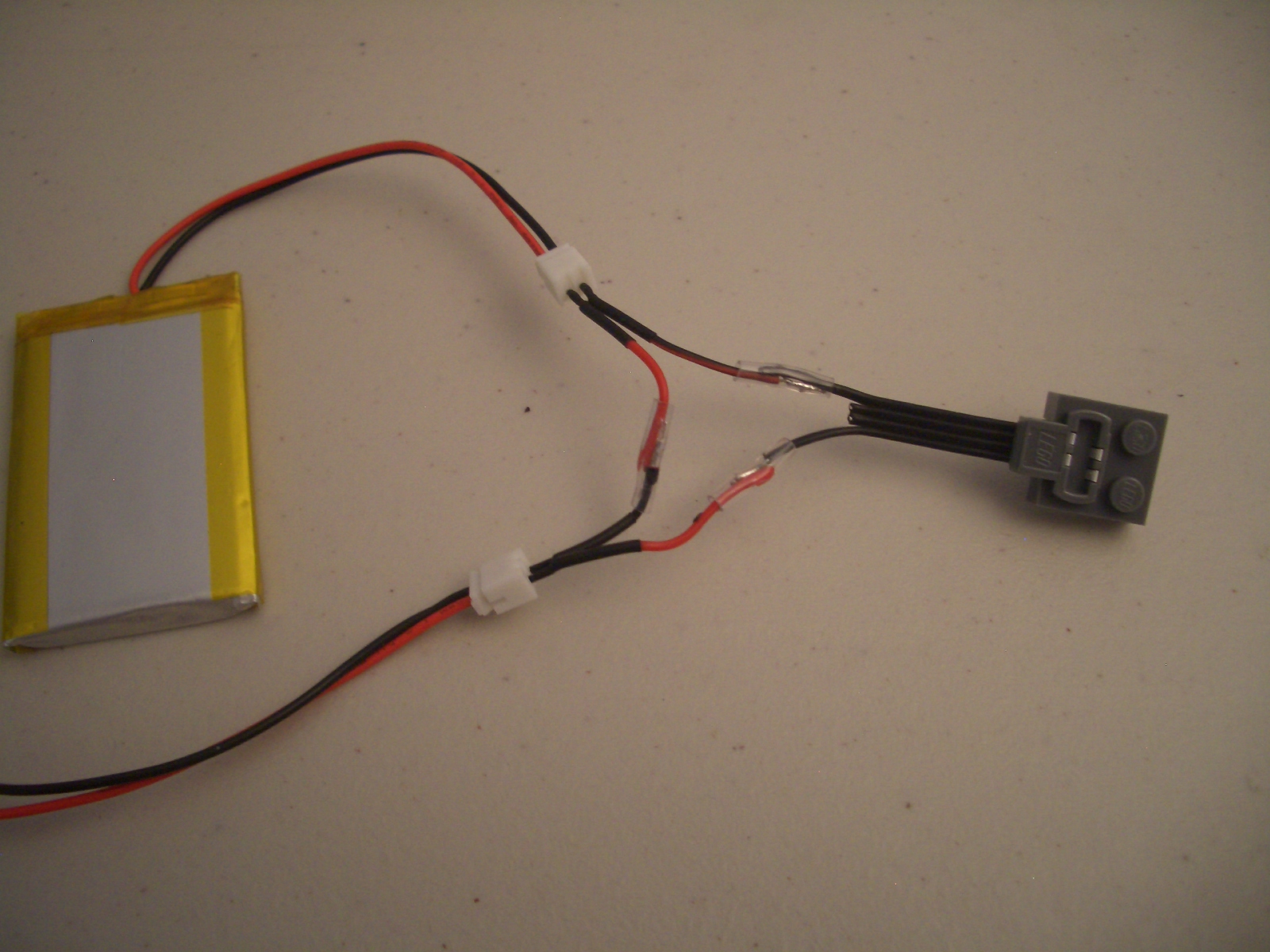 So I needed another solution. I bought two LiPo (Lithium Ion Polymer) batteries and chargers from adafruit.com and wired them up in series using an 8886 LEGO Power Functions Extension Wire.